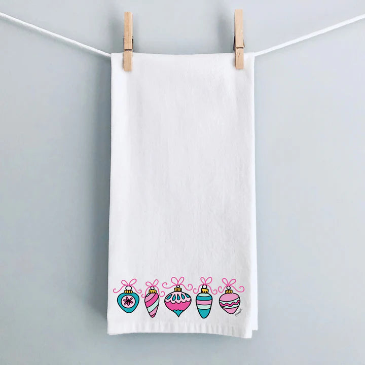 Merry & Bright Pink Bow Christmas Ornaments Floursack Tea Towel