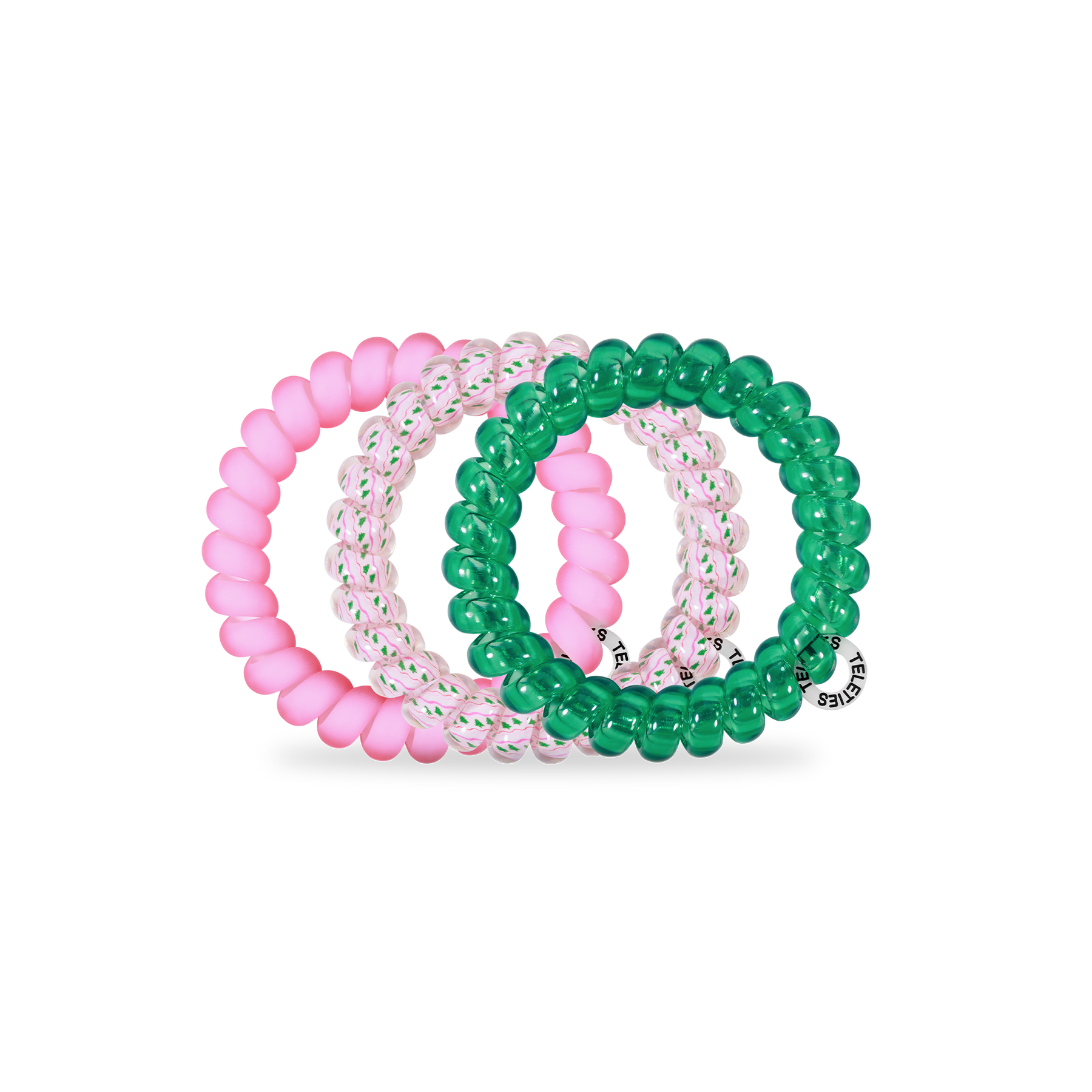 Merry Pinkmas Large Hair Ties in Pink and Green offer a strong grip without damage, doubling as a chic wrist accessory when not in use. Your new favorite hair essentials all year round. Strong grip, no rip design for all-day hold Doubles as a stylish bracelet Durable and waterproof for all occasions Gentle on hair—prevents breakage, headaches, and creases Sold in packs of three.
