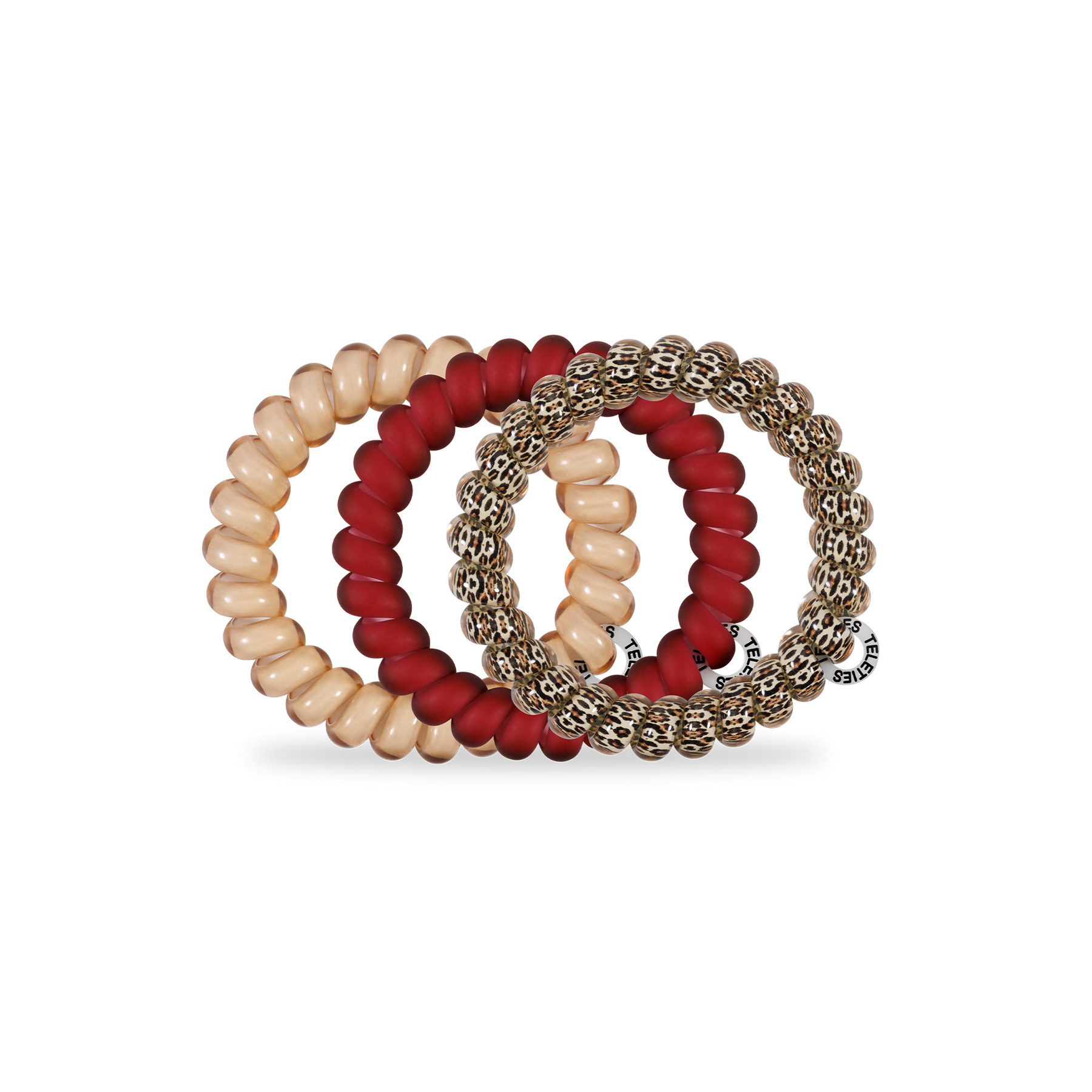 Wild Side Large Hair Ties in Burgundy and Beige offer a strong grip without damage, doubling as a chic wrist accessory when not in use. Your new favorite hair essentials all year round. Strong grip, no rip design for all-day hold Doubles as a stylish bracelet Durable and waterproof for all occasions Gentle on hair—prevents breakage, headaches, and creases Sold in packs of three.