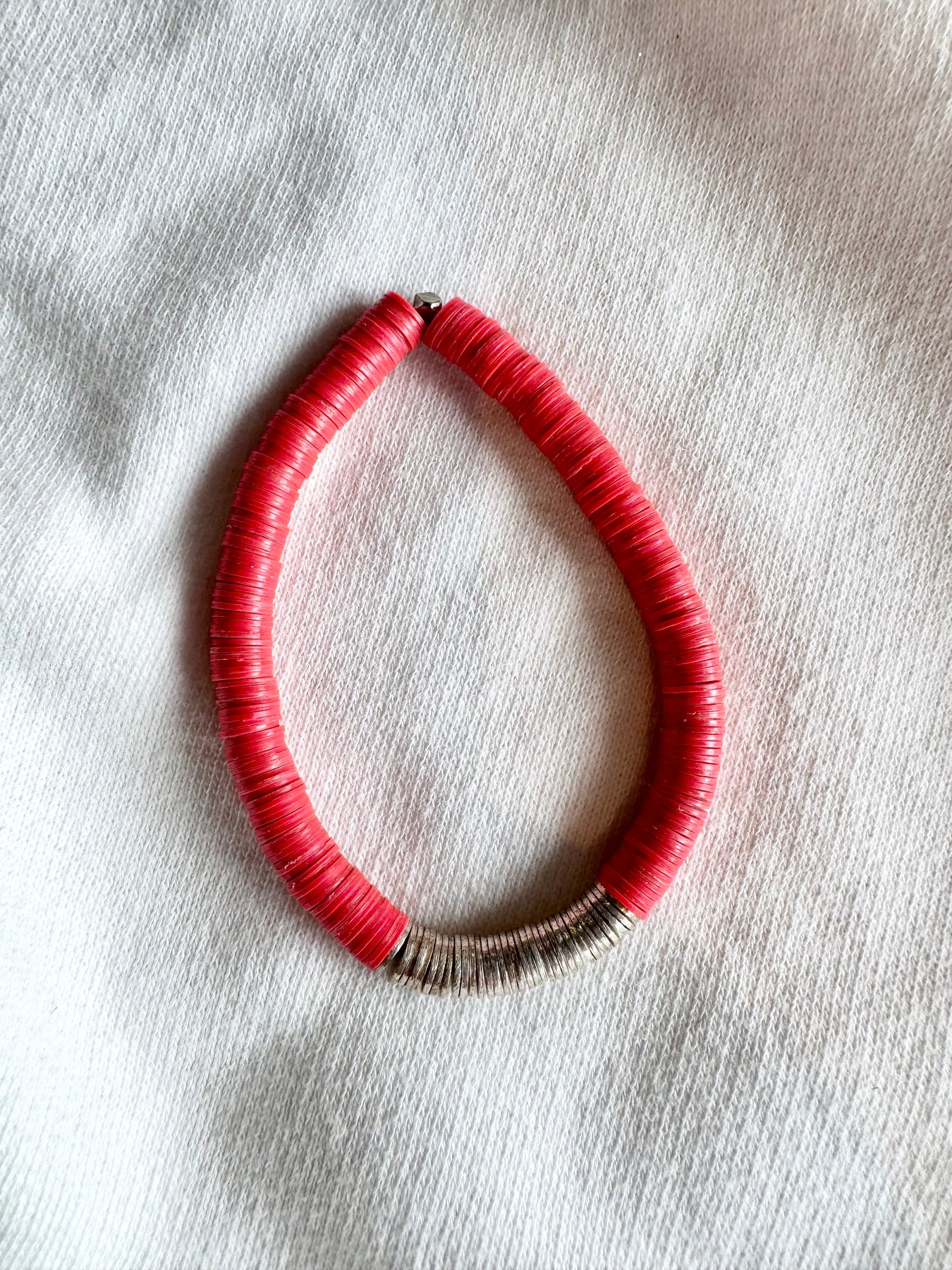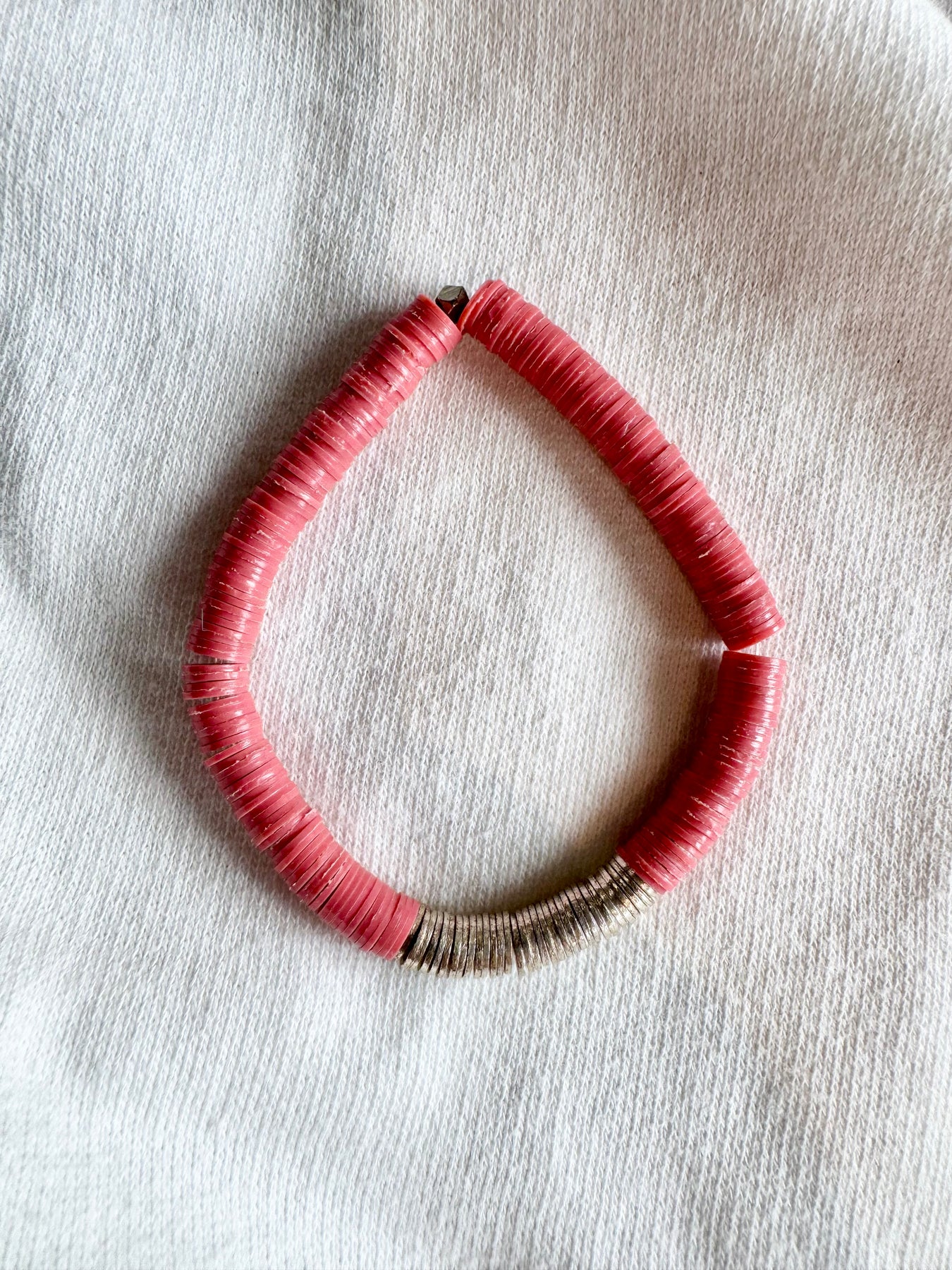 Five flat bead bracelets in shades of pink, orange, and red, with gold and silver accents.