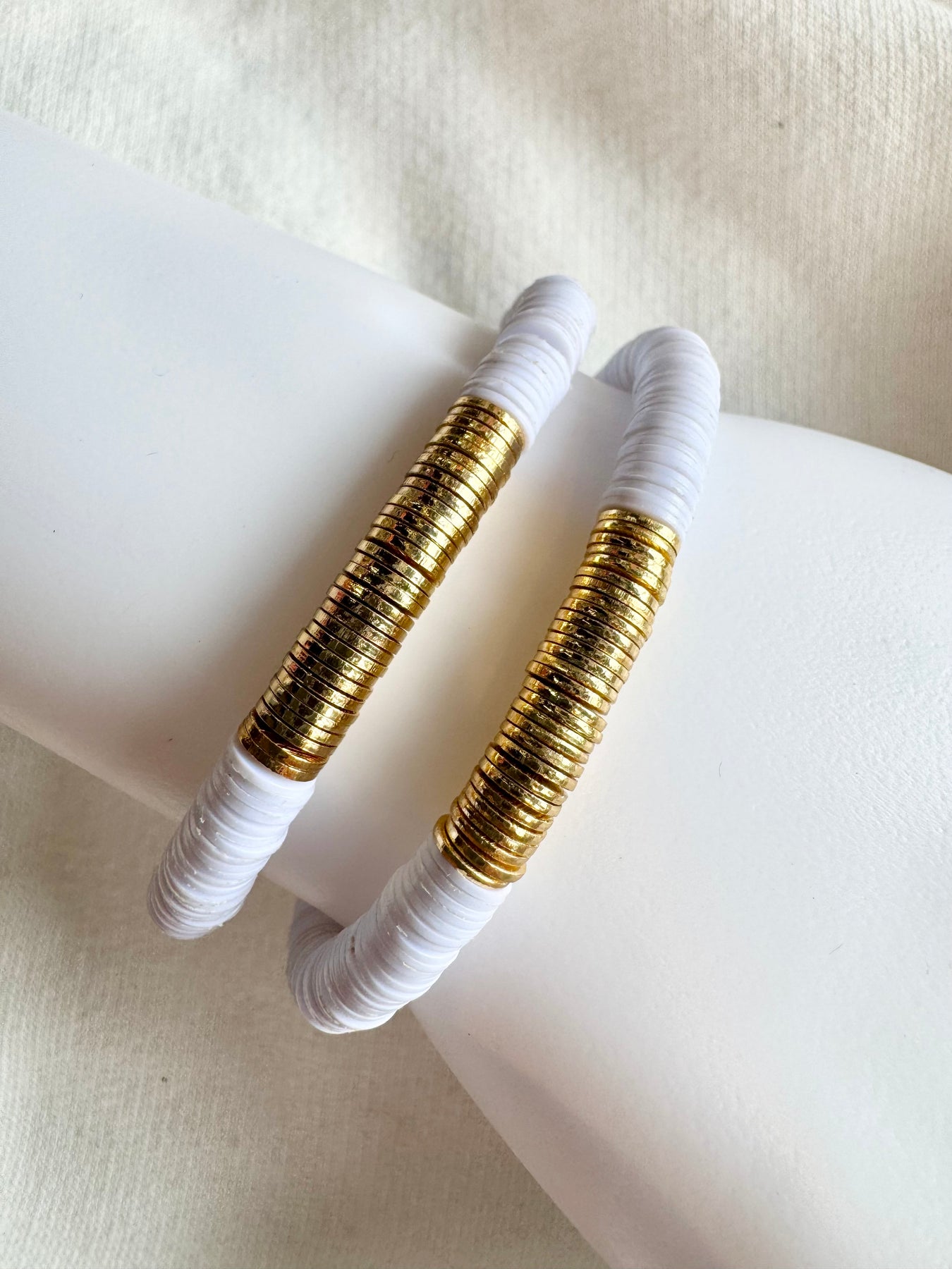 Two white flat bead bracelets with gold-plated accents are displayed on a white surface.