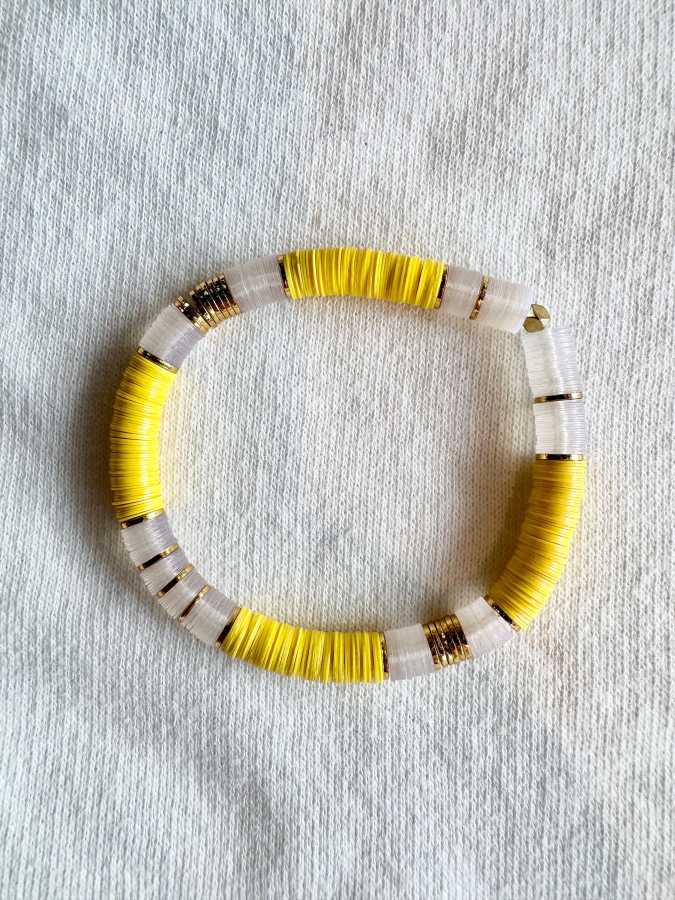 A large flat bead bracelet with alternating sections of yellow and clear beads, separated by gold rings.