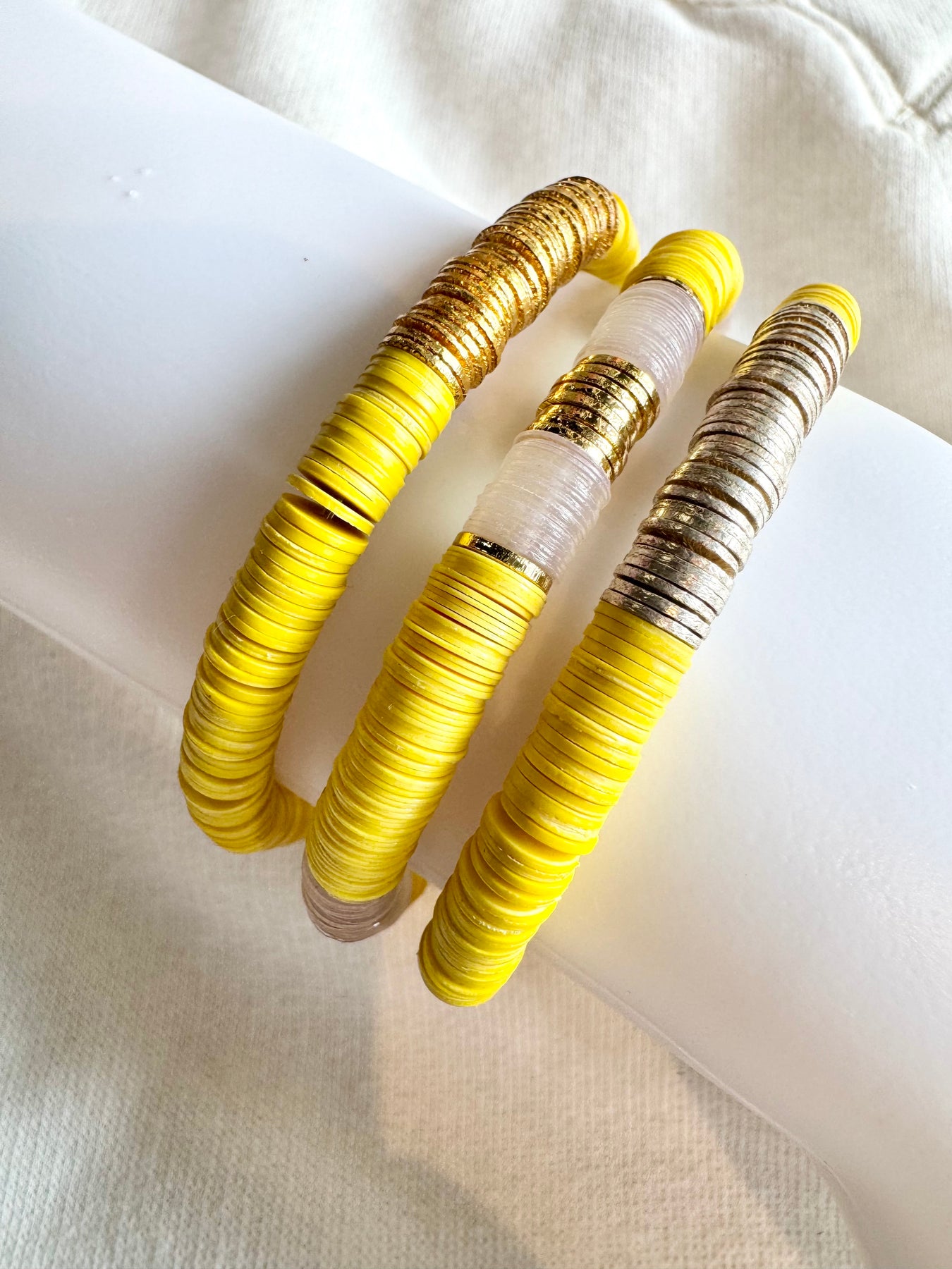 Three yellow flat bead bracelets, two with gold and one with silver accents.