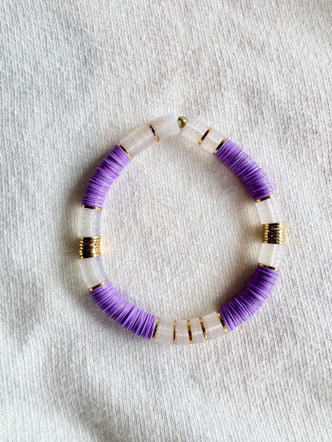 Large flat bead bracelet with purple and clear vinyl beads and gold spacers.