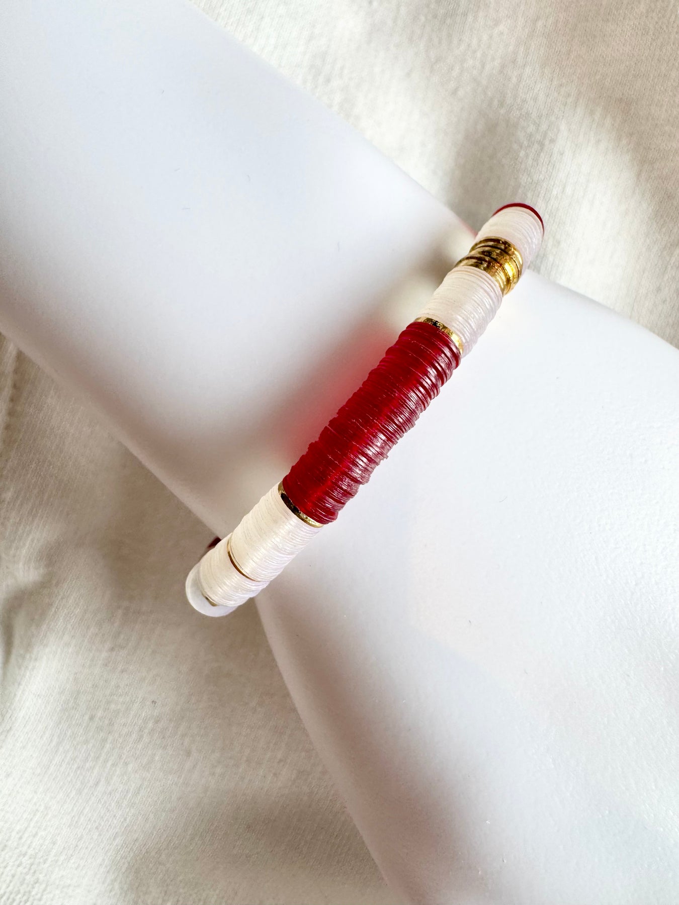Large flat bead bracelet with red and white vinyl beads and gold accents.