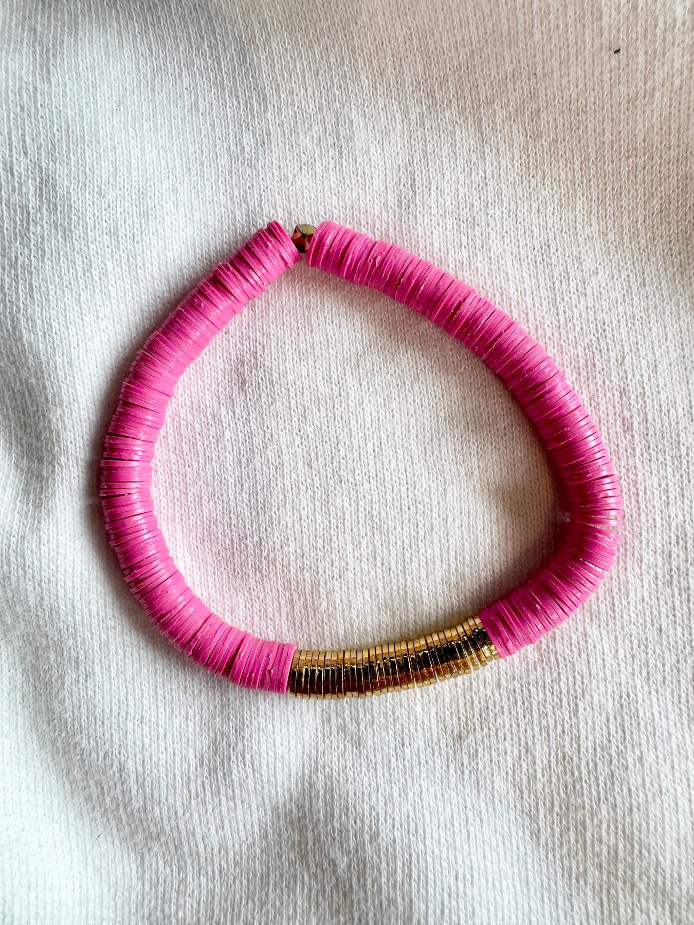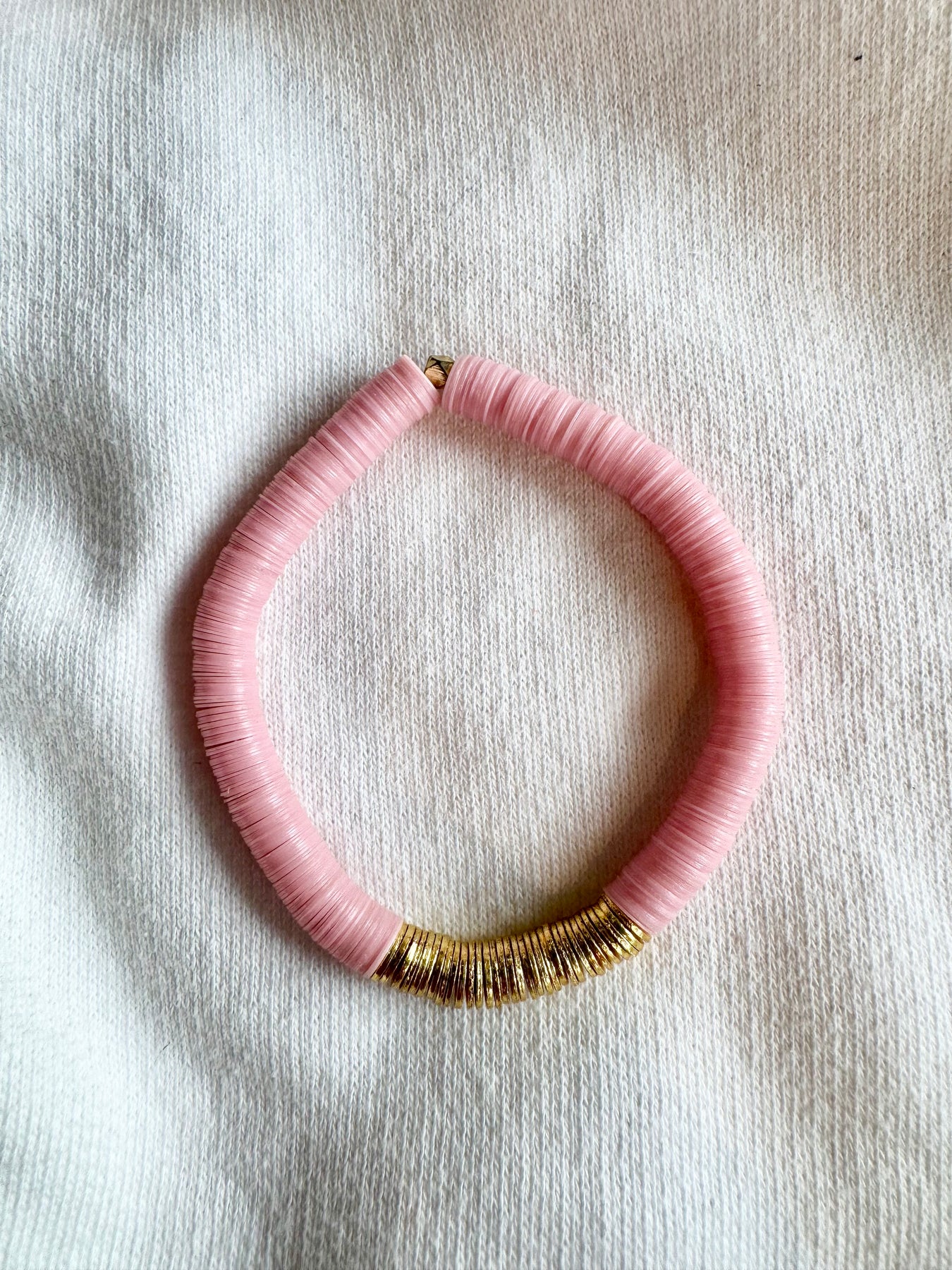 Large flat bead bracelet with pink vinyl beads and gold accents.