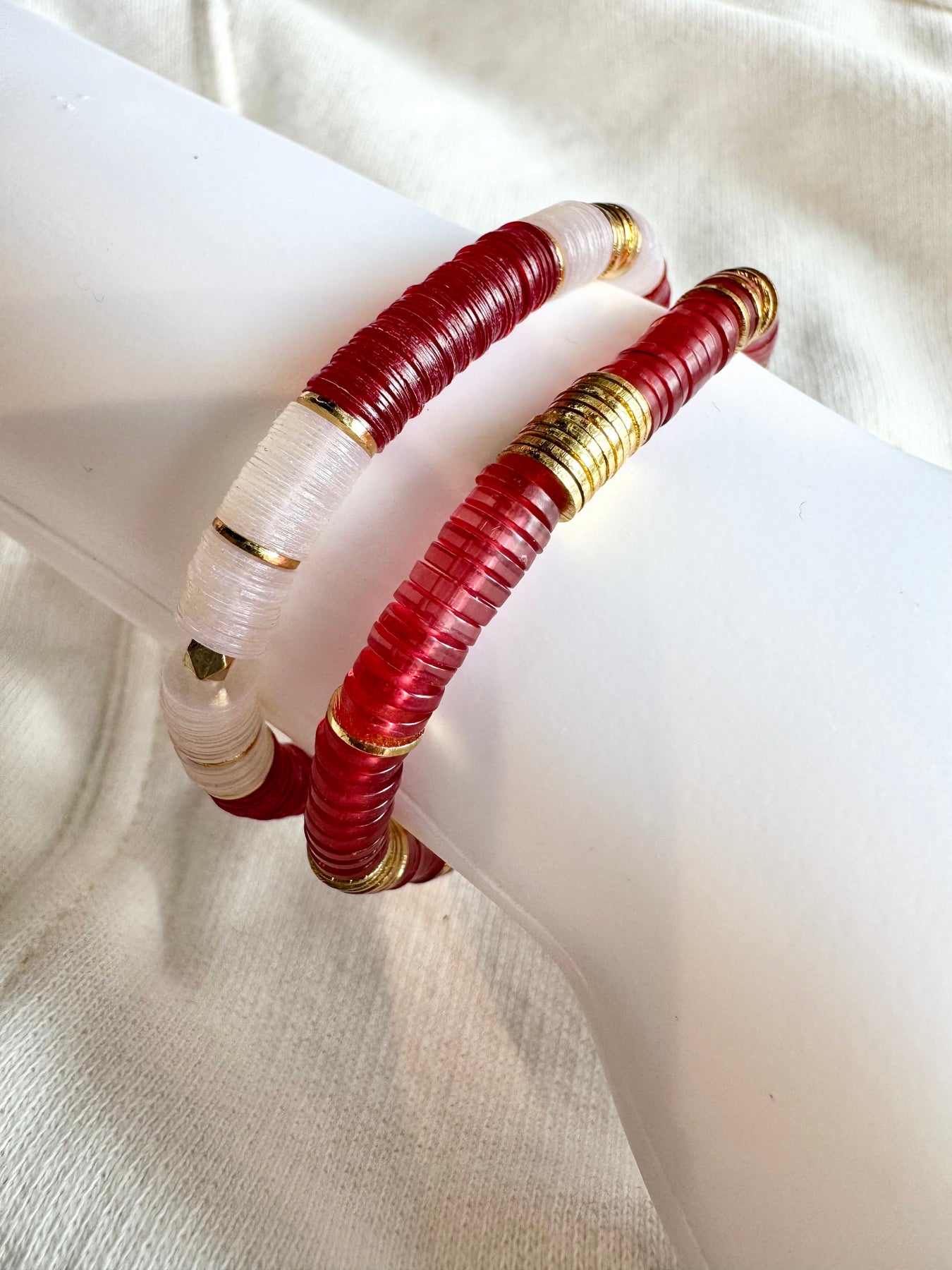 Two red and white flat bead bracelets with gold accents are displayed on a white surface.