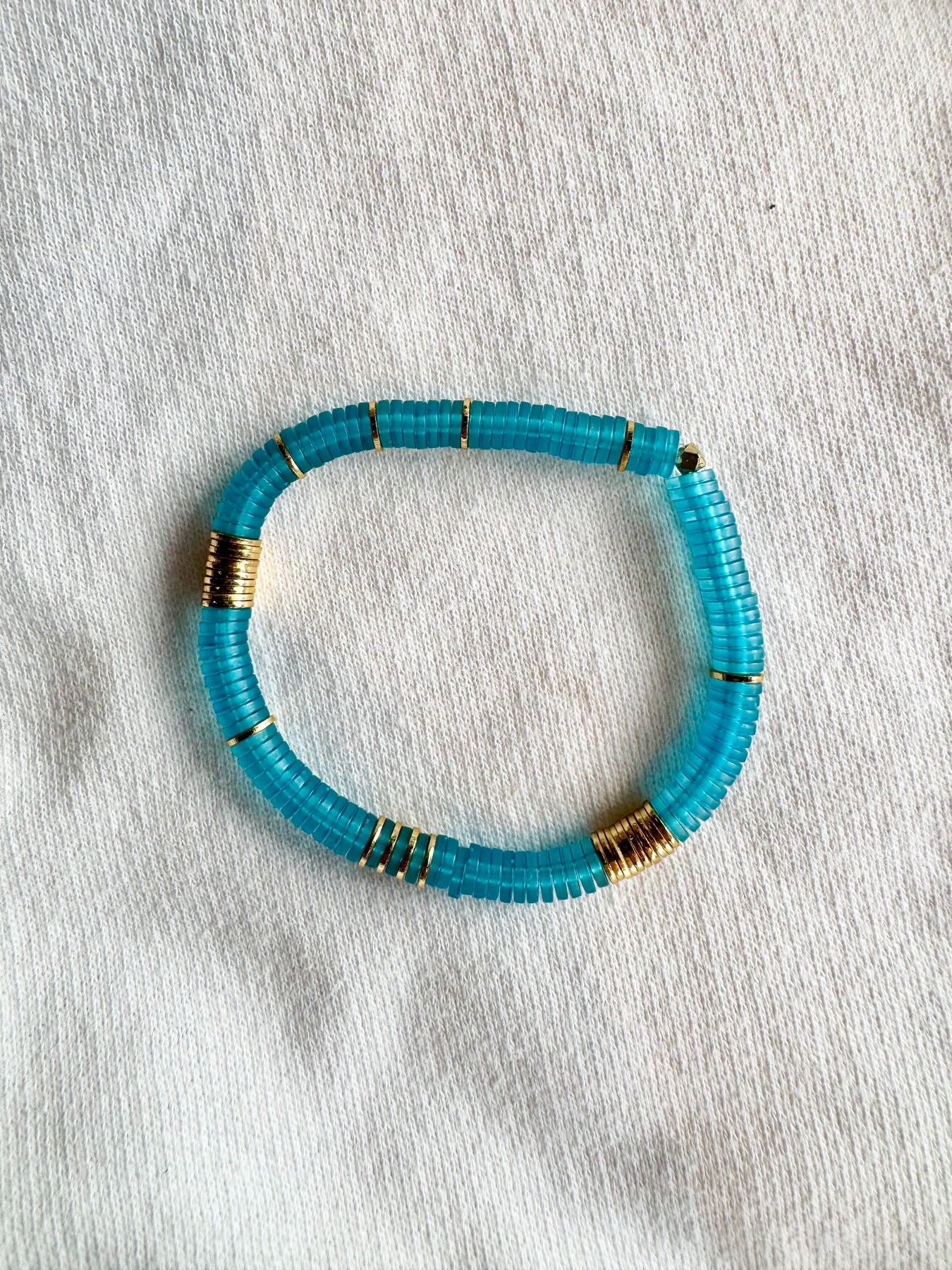Large flat bead bracelet with turquoise vinyl beads and gold-plated accents.